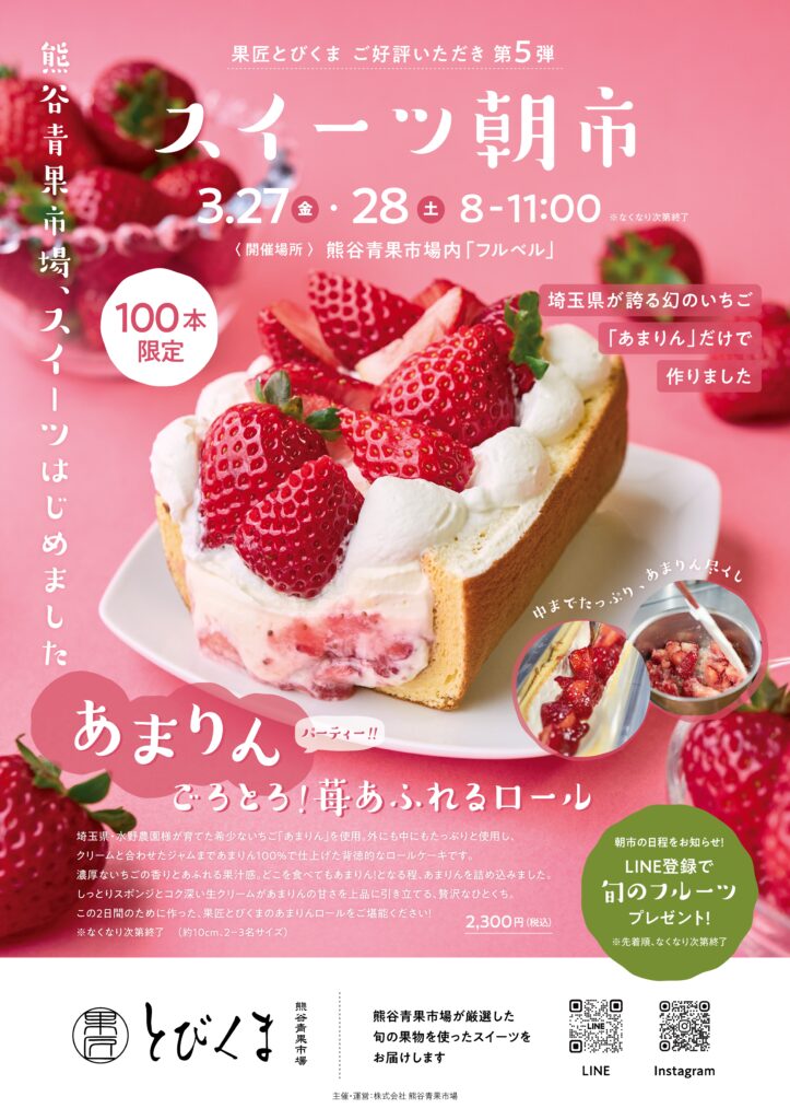 令和8年3月27日(金)と28日(土)の2日間、熊谷青果市場内「フルベル」店舗にて、第5回スイーツ朝市を開催いたします!!